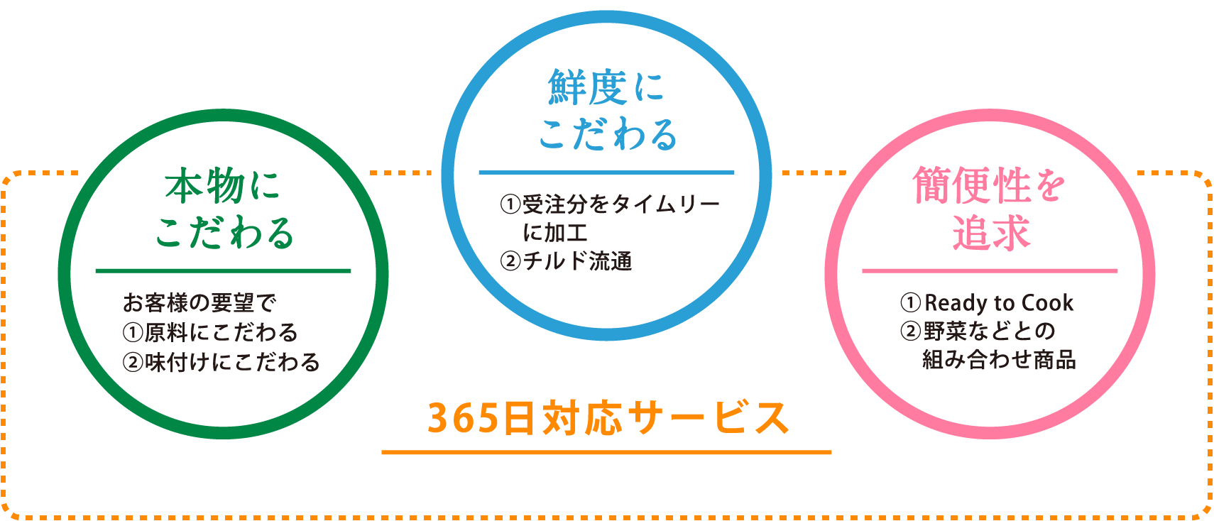 原材料の調達から出荷まで、徹底した鮮度・衛生管理のもと、お客様のさまざまなニーズに365日年中無休で対応いたします。