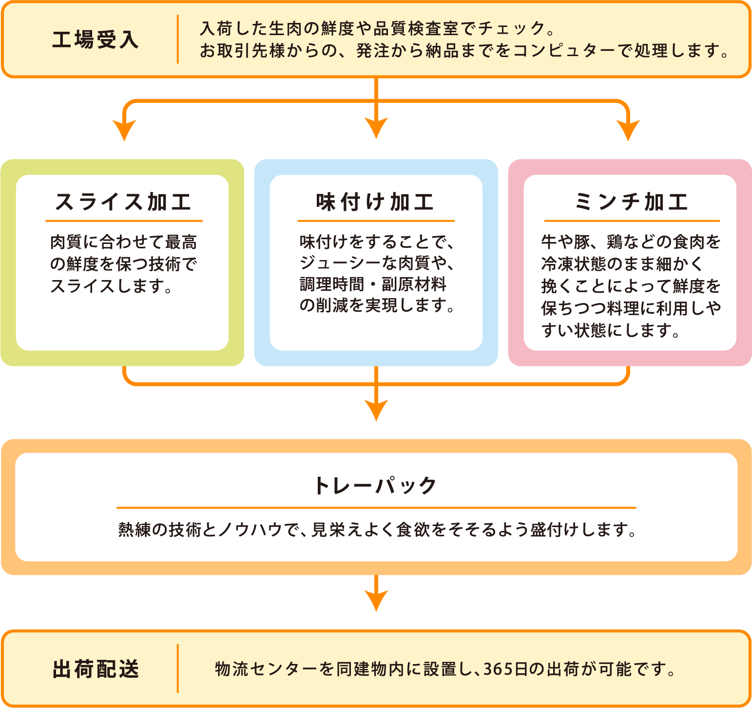 徹底した鮮度管理、衛生管理に基づき、365日休むことなく、新鮮な食肉を、必要な時に必要な量だけ、加工して出荷いたします。